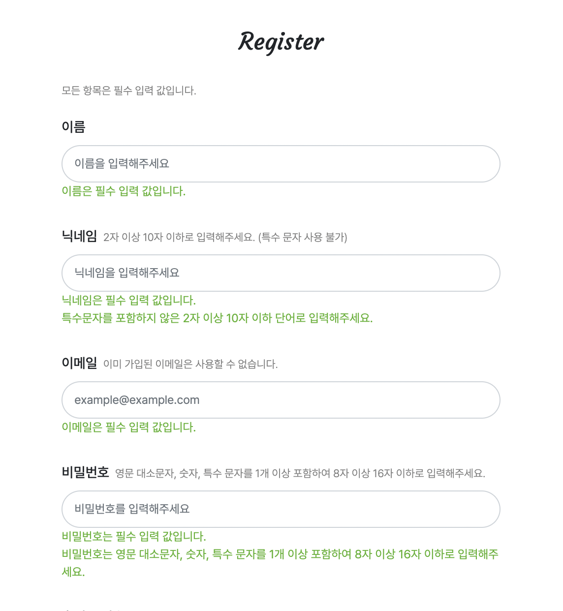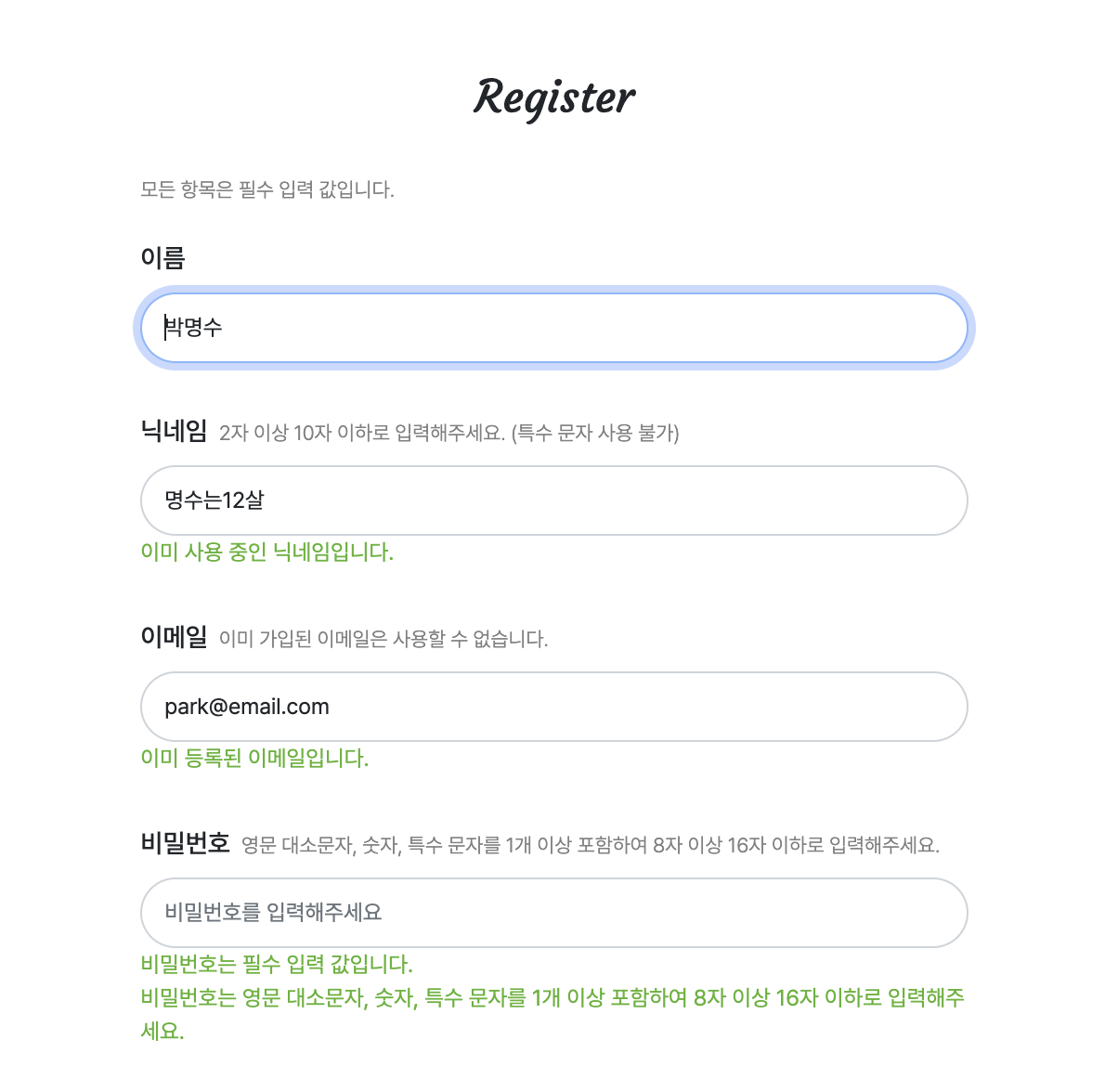 회원가입 시 사용자가 입력한 정보가 서버로 전송되기 전에 특정 규칙에 맞게 입력했는지, 이미 사용하고 있는 닉네임이나 이메일은 아닌지 확인하는 검증 단계가 필요하다.